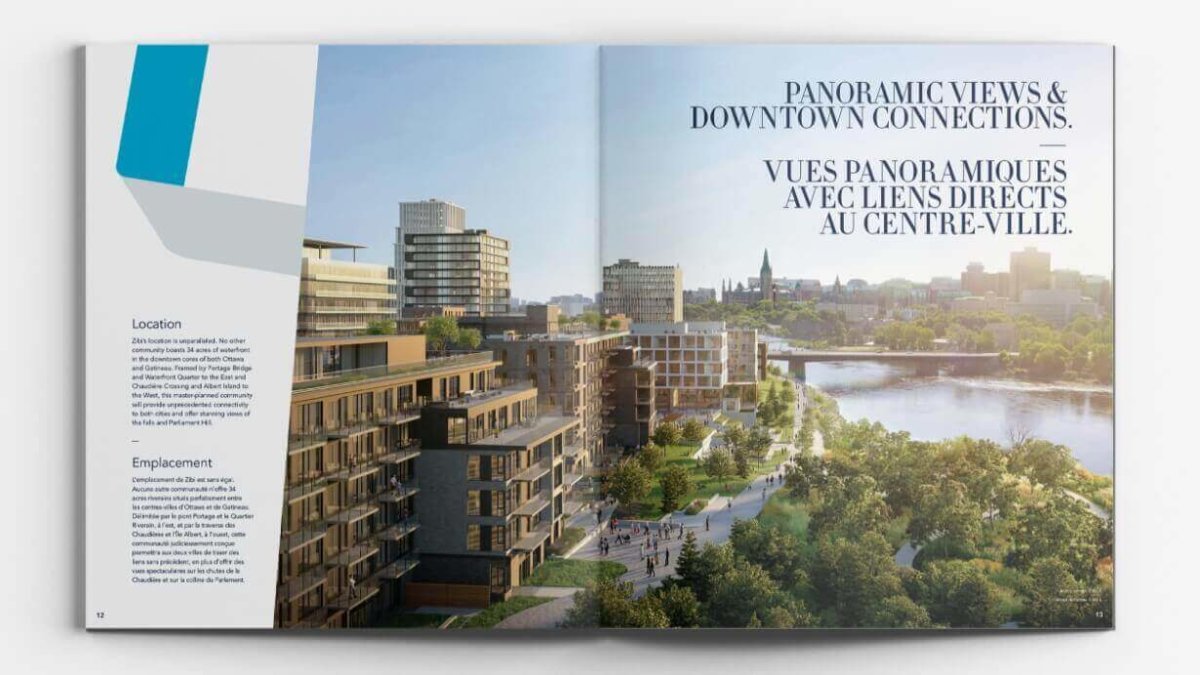 Zibi is a massive 35-acre sustainable mixed-use development by Dream, located in both Downtown Ottawa and Gatineau. The site spans two provinces, and therefore two languages, two healthcare systems, two different real estate values and distinct cultures. Zibi represents a wealth of riches, from its matchless waterfront location to its world-class sustainability (it’s one of just 10 OnePlanet communities globally), but the public was confused.