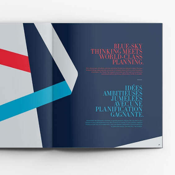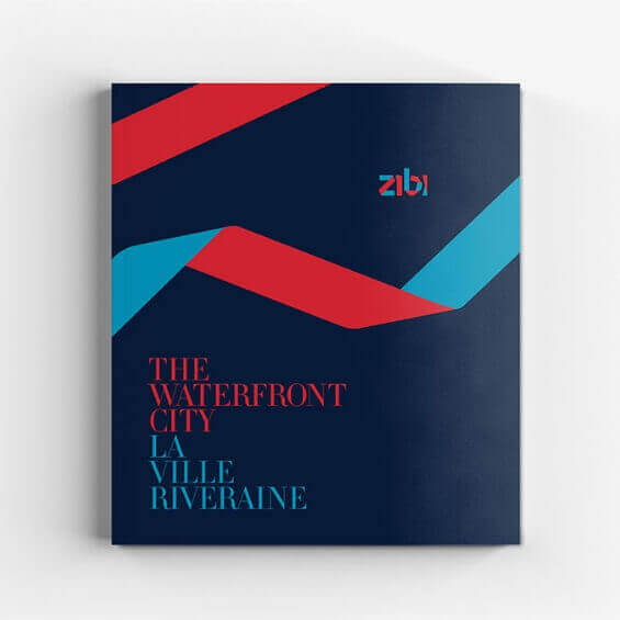 We developed a simple ribbon motif that would allow us to literally tie Zibi together. A ribbon is a celebratory symbol common to ceremonies and festivals across the globe. In this case ribbon represents unity and celebration. Its colour palette was directly influenced by the provincial flags of both Ontario (red) and Quebec (blue). The motif became a representation of this borderless community, and it wove itself throughout the launch campaign, appearing in print and digital executions, connecting hoarding panels across the actual site and even inspiring an event series that brought an inaugural audience to an under-construction ZIbi and impressed upon the public the immense scale of this project.